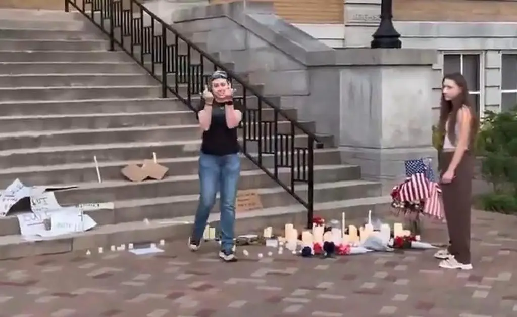 The makeshift tribute—candles, flowers, and signs honoring Kirk's legacy—was methodically destroyed. Rollo, 23, ripped posters, kicked over candles, and shouted obscenities, declaring Kirk "lived as he died—promoting violence." Her defiant middle finger to the camera captured the raw contempt.